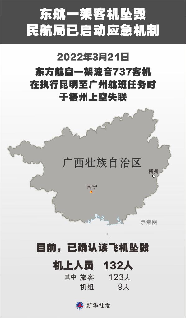 记者从民航局获悉,2022年3月21日,东方航空一架波音737客机在执行昆明至广州航班任务时,于梧州上空失联。目前,已确认该飞机坠毁。机上人员共132人,其中旅客123人、机组9人。