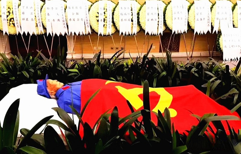 王定国同志身着女红军服装,安卧在鲜花翠柏丛中,身上覆盖着鲜红的中国共产党党旗。