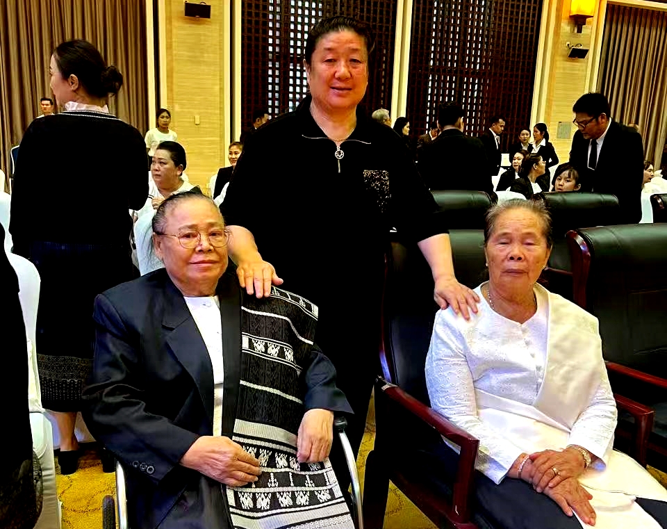 老挝前国家主席坎代·西潘敦夫人通婉·西潘敦(前左)老挝前国家主席本扬·沃拉吉夫人坎蒙·沃拉吉(前右)中外抱团网·中国-东盟企业俱乐部秘书处副秘书长宋桂香(后中)