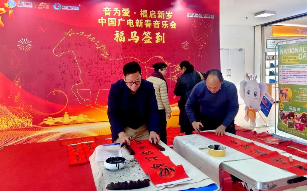 传统文化互动体验:特邀书画家现场“送福”、书写春联,将表演艺术与视觉艺术、民俗文化相结合,增强了活动的参与性与传播性,让市民不仅是观众,更是文化的体验者和收获者。