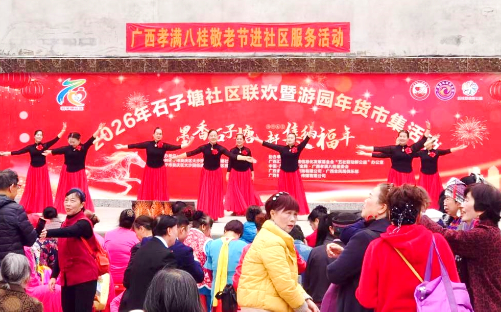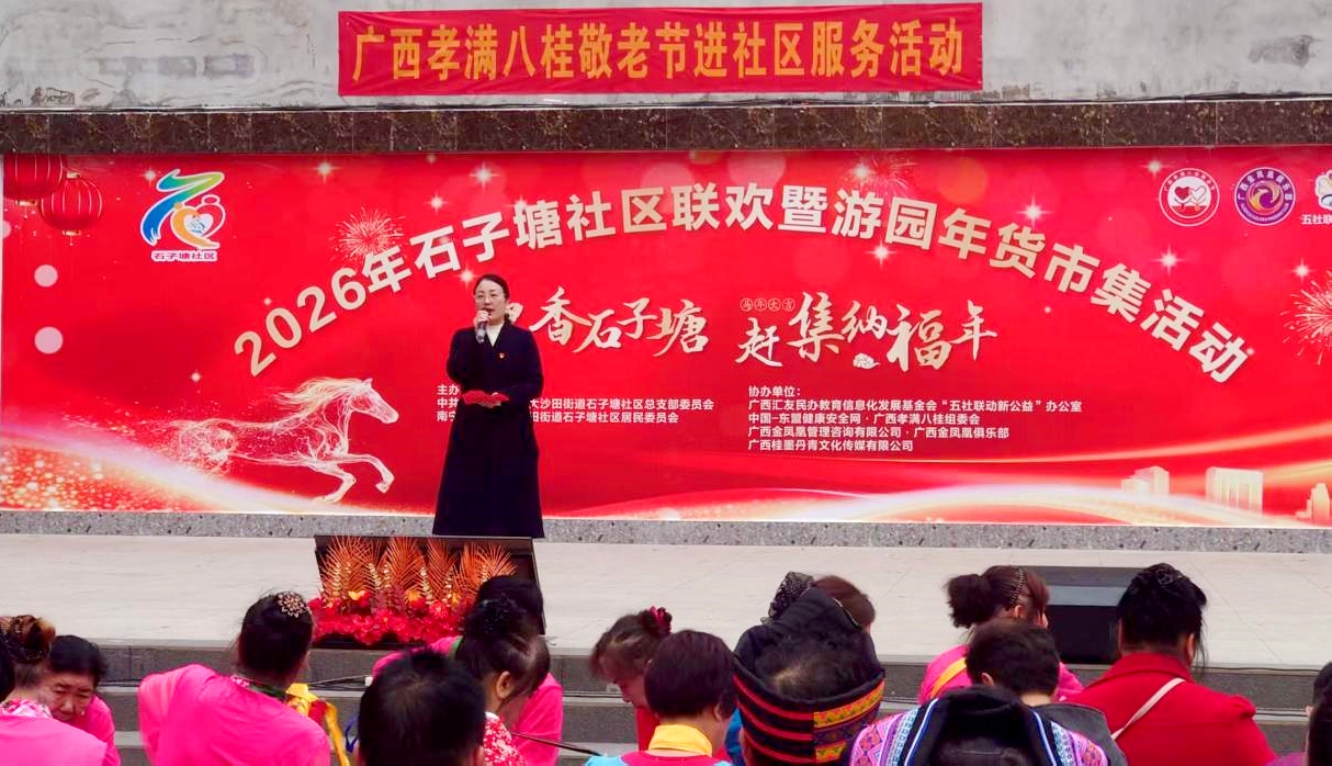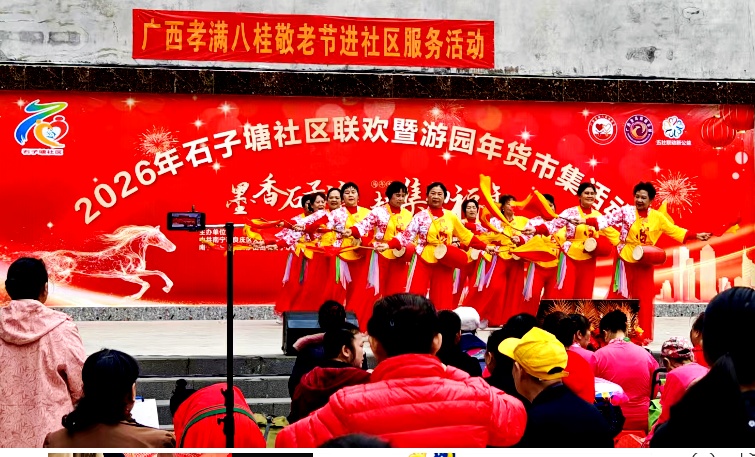 2026年2月7日上午9时30分,南宁市良庆区石子塘社区红石榴广场上锣鼓阵阵、笑声盈盈,一场以“墨香石子塘·赶集纳福年”为主题的迎新春社区联欢暨游园年货市集活动在此热闹举行。本次活动由石子塘社区主办,广西孝满八桂组委会、五社联动新公益办公室、广西金凤凰俱乐部、广西桂墨丹青书画院等团体联合协办参与,吸引近500名居民扶老携幼齐聚一堂,共迎新春。