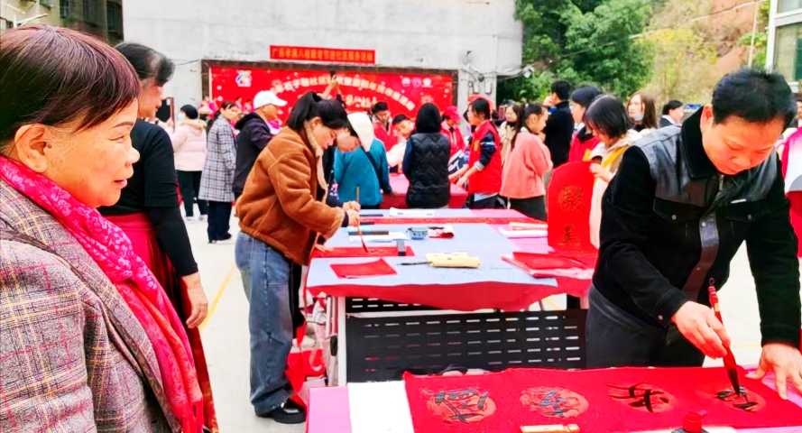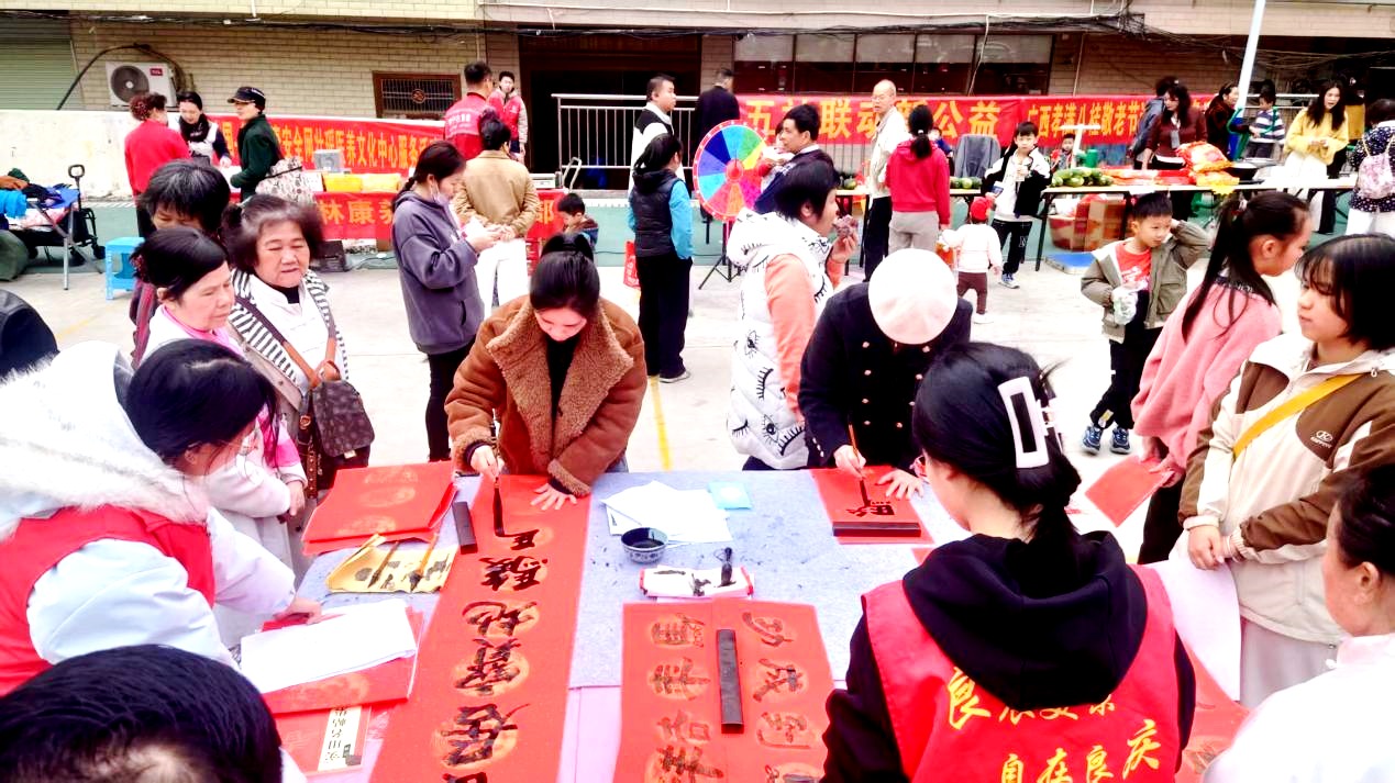舞台一侧,墨香四溢。广西桂墨丹青书画院的书法家们现场挥毫,笔走龙蛇,一幅幅寓意吉祥的春联和“福”字在他们手中诞生,并免费赠送给居民。红纸黑字间流淌的是年味,也是文化的传承。