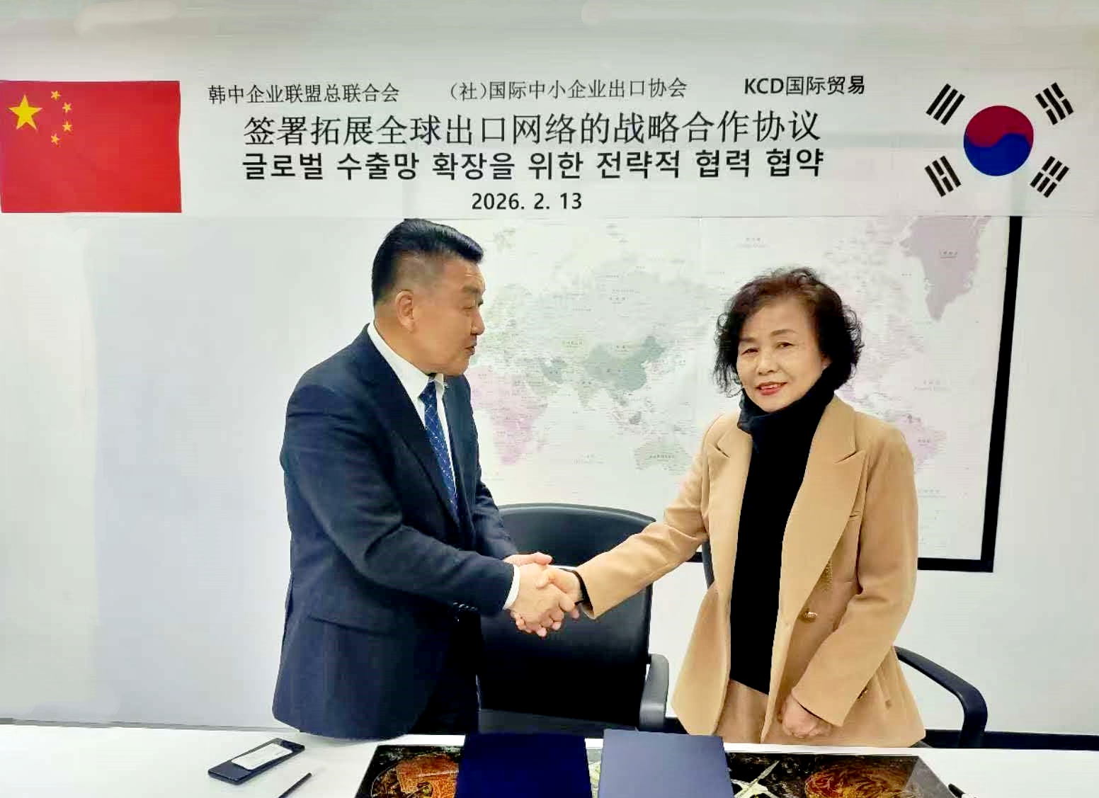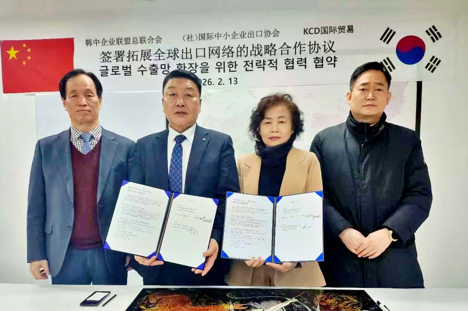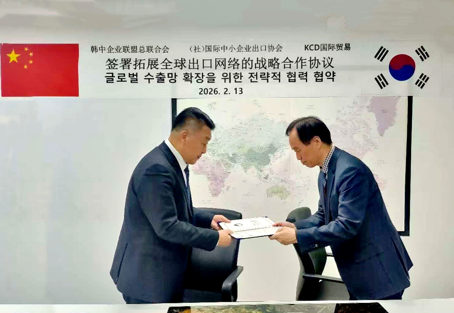 2026年2月13日,韩国社团法人国际中小企业出口协会(ISMEA)、韩中企业联盟总联合会与KCD国际贸易三方签署合作,整合三方优势资源与全球网络,为韩国中小企业(K-SME)进军全球市场搭建全方位支撑体系,推动韩国优质产品走向世界。
