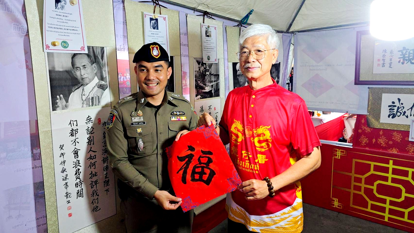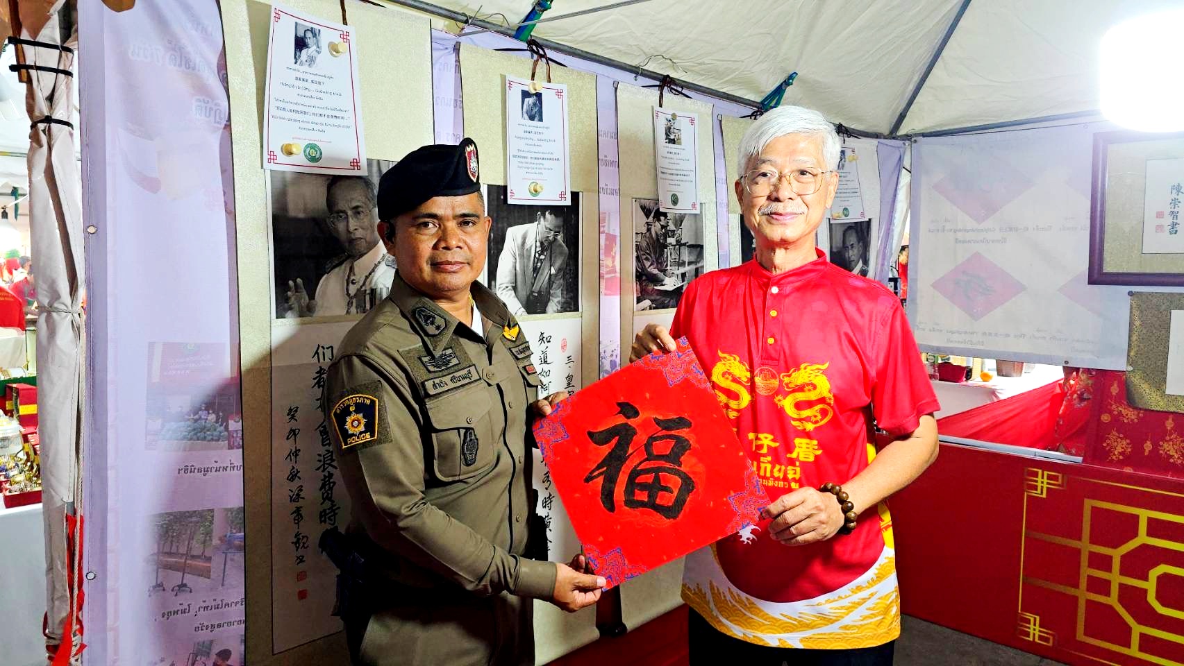 开幕式期间,府尹阿纳·乍能诗实地参观了庆典现场的各个摊位,详细了解摊位运营及展示内容。本次盛会共设置120多个食品和纪念品摊位,其中110个摊位展示文化产品,10个摊位专门展示泰中艺术与文化,品类丰富、特色鲜明。府尹重点参观了梁竹文先生的艺术摊位,与梁竹文先生亲切交谈,深入了解其展示的艺术作品。活动最后,中外抱团东盟企业俱乐部荣誉主席、泰国世界百家姓艺术基金博物馆主席梁柱稳向府尹阿纳·乍能诗赠送了彭桂丰老师创作的中国水墨《马到成功》画作,双方合影留念,定格下泰中友好的温馨瞬间。