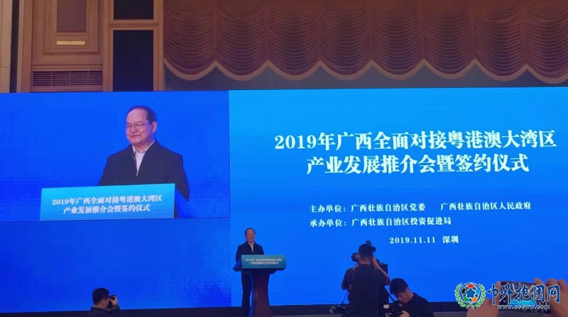 中外抱团网2019年11月11日中国深圳消息(图文:乔立华)2019年广西壮族自治区全面对接粤港澳大湾区产业发展推介会暨签约仪式今天在深圳隆重举行。广西壮族自治区党委书记鹿心社出席并作重要讲话,广西壮族自治区人民政府主席陈武主持会议并见证了中国平安保险、华为、万科、正威、绿地、中国奥园等一批有实力的公司签约数千亿元投资广西。这些世界500强企业将在大物流、大数据、大健康、文化旅游,新能源、等多项领域推进广西经济在新时代大发展。美国纽约华人侨团联合会主席、美国广西总商会主席、中外抱团专家乔立华经过近一年的努力,为上述企业在今天的对接会上成功签约出力献策,助推家乡广西的发展发挥应有的作用。