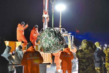 ▲12月17日,工作人员将嫦娥五号返回器吊运至装载车辆。